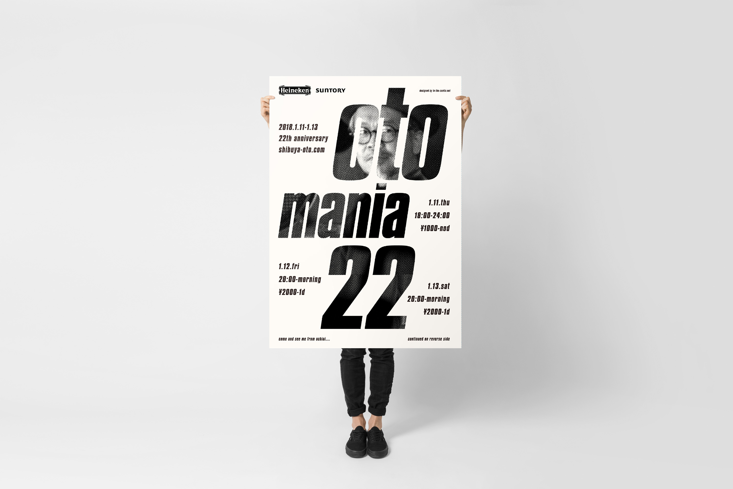 OTOの周年フライヤーをデザインするのも11回目、今年もmacの前でニヤつきながら、撮りためた落合さんの写真をフィーチャー。当初は落合さんの丸眼鏡を使って「OTO」って入れようかな?とか思いましたが「OTO MANIAって入れたいんだよね、よろしく。」ってLINEが来てたのでリクエスト通りでっかく入れて、ちょい90年代っぽい仕上がりに。お互いの距離感の成果物として一気に出来上がるフライヤーも面白いものです。OTO22周年は1/11-1/13の3日間開催、自分は毎年恒例のナッシーのcoup d’état!の日に出ます。よろしくどうぞ。http://www.shibuya-oto.com