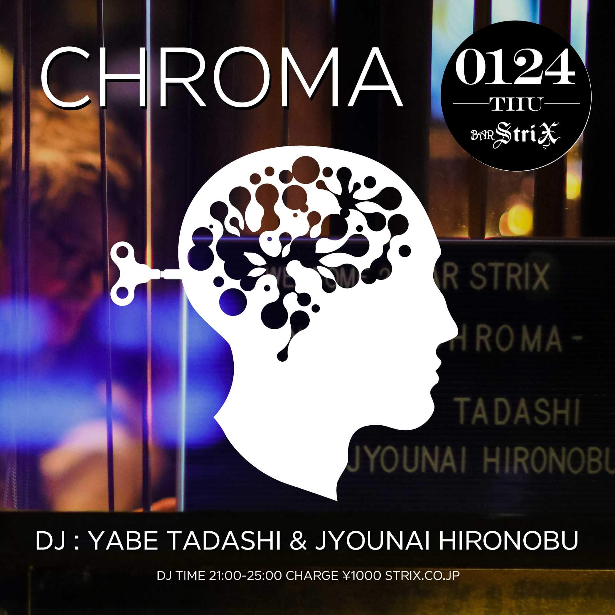 1.24.thu CHROMA // DJ : 矢部直 & 城内宏信 // No Charge! 21:00-2:00 // 西麻布バーストリクスで矢部さんと交互に1時間交代で2時まで。カウンター向かいにDJブースがありますのでお一人でもふらっと寄って下さい。 オーセンティックバーさながらの本格的なカクテルや豊富なウィスキーをぜひ。※六本木ヒルズより246を渋谷方面へ。西麻布交差点手前のラーメン屋「赤のれん」近く。鉄の扉が目印。