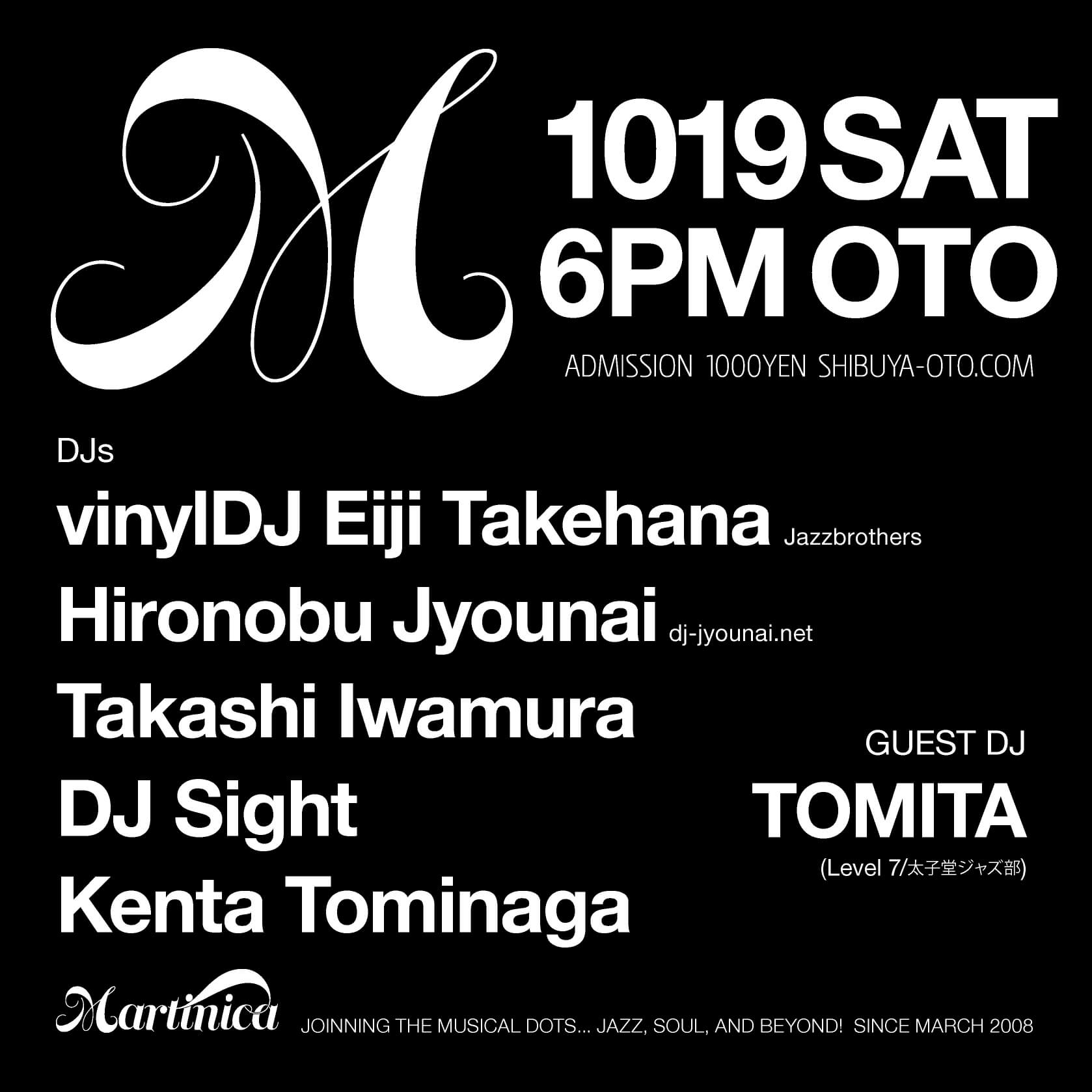10.19.sat Martinica // Guest DJ: TOMITA // DJs: vinylDJ Eiji Takehana(Jazzbrothers), Hironobu Jyounai(dj-jyounai.net), Takashi Iwamura, DJ Sight // OPEN 18:00-23:00 ¥1000-NoD // shibuya-oto.com
