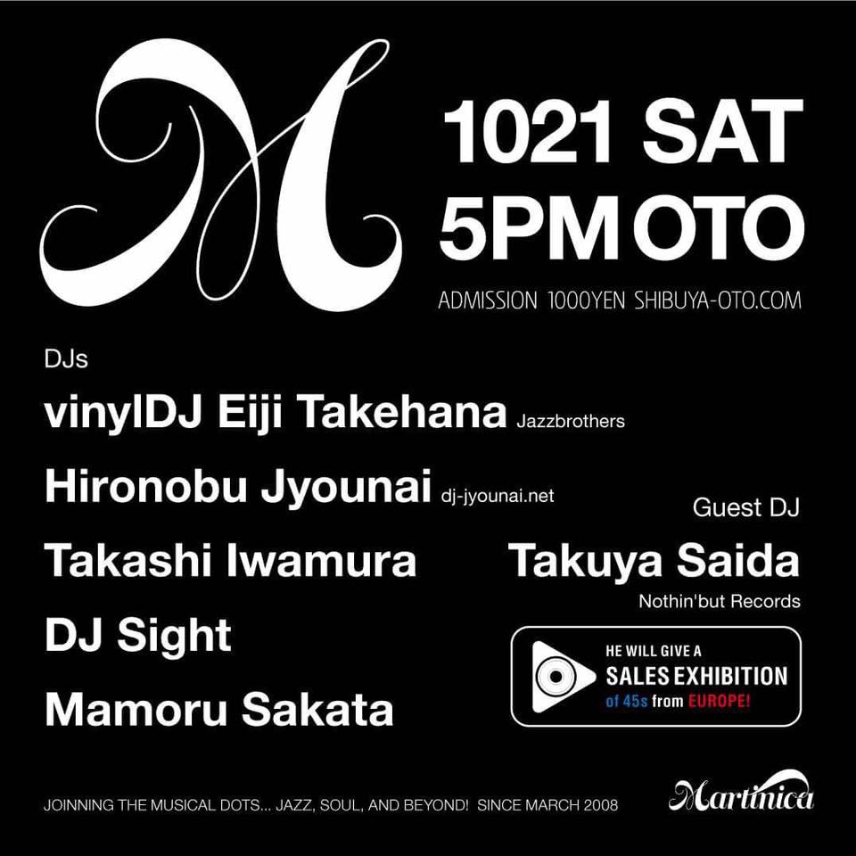 10.21.sat. Martinica // Guest DJ: Takuya Saida(Nothin’ but Records) // DJs: vinylDJ Eiji Takehana(Jazzbrothers), Hironobu Jyounai(dj-jyounai.net), Takashi Iwamura, DJ Sight, Mamoru Sakata // OPEN 17:00 ¥1000-NoD // shibuya-oto.com // https://www.facebook.com/events/177699526110385/