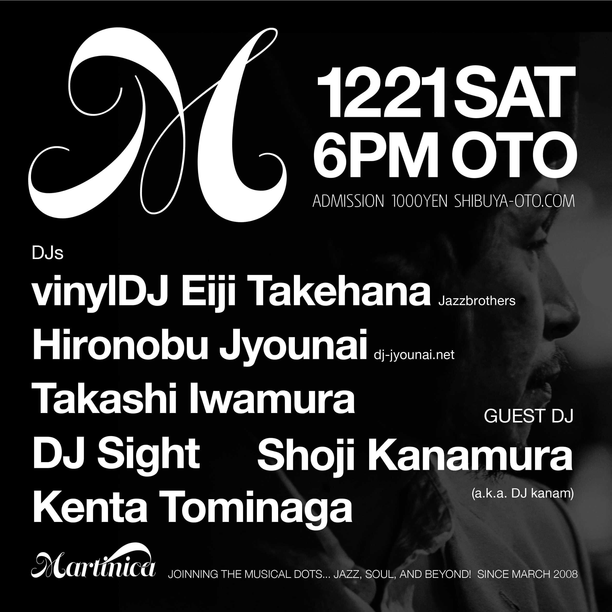 12.21.sat Martinica //Guest DJ: 金村章次 a.k.a dj kanam // DJs: vinylDJ Eiji Takehana(Jazzbrothers), Hironobu Jyounai(dj-jyounai.net), Takashi Iwamura, DJ Sight, Kenta Tominaga // OPEN 18:00-23:00 ¥1000-NoD shibuya-oto.com