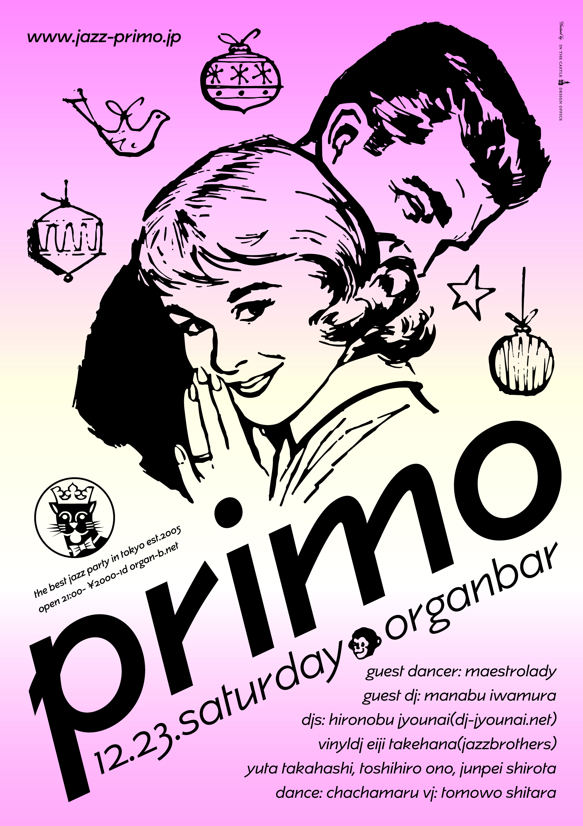 To get there you should definitely go up the stairs with light steps! organ-b.net // 12.23.sat. PRIMO // Guest DJ: Manabu Iwamura // Guest Dancer : maestrolady – Akari, Kaori, Masumi, Maiko // DJs: Hironobu Jyounai(dj-jyounai.net), vinylDJ Eiji Takehana(Jazzbrothers), Yuta Takahashi, Toshihiro Ono, Junpei Shirota // DANCE : Chachamaru // VJ: Tomowo Shitara // OPEN 21:00 Charge ¥2000-1D