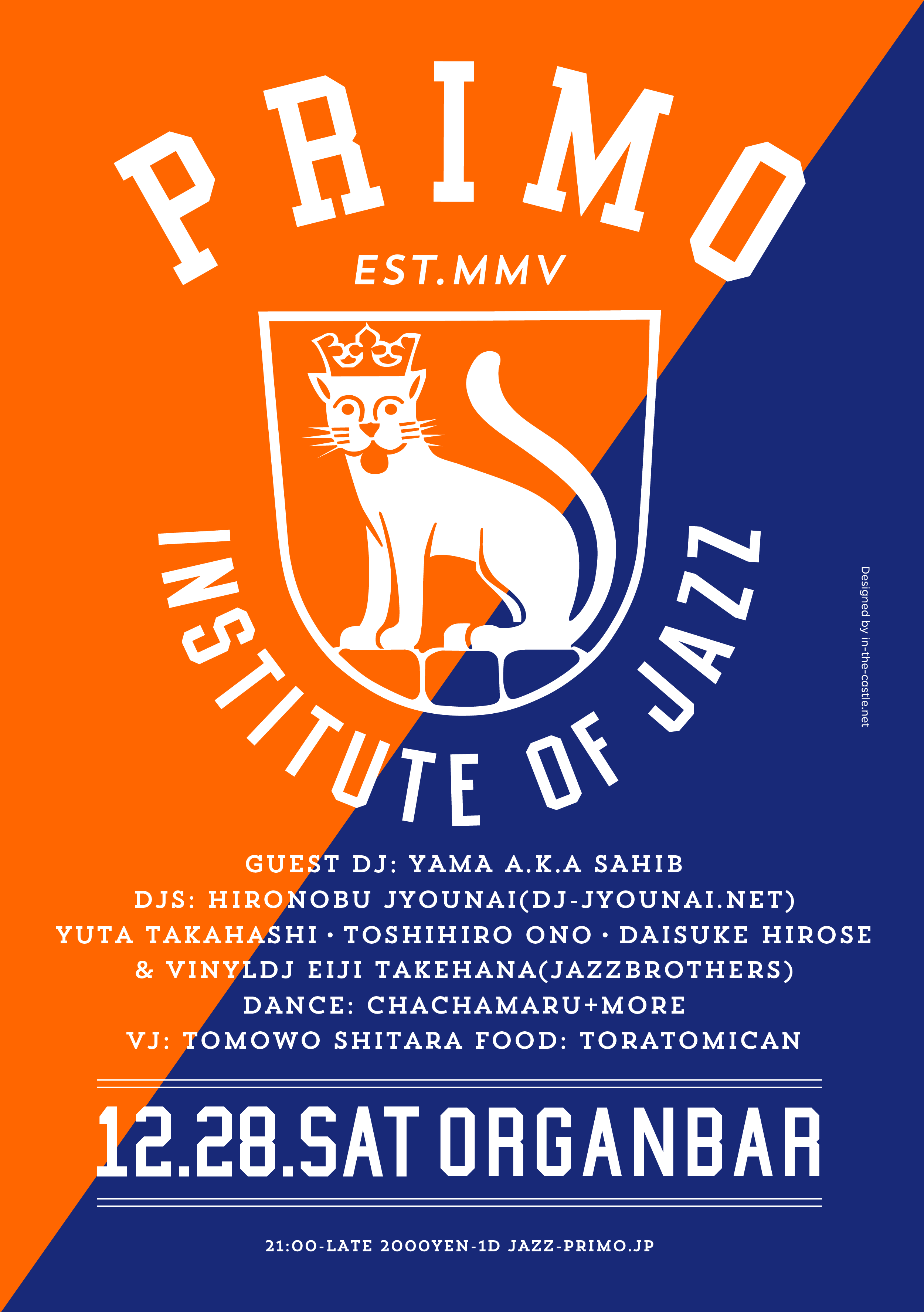 12.28.sat. PRIMO // GUEST DJ: Yama a.k.a. sahib // DJs: Hironobu Jyounai(dj-jyounai.net), Yuta Takahashi, Toshihiro Ono, Daisuke Hirose, & vinylDJ Eiji Takehana(Jazzbrothers), // DANCE : Chachamaru+more // VJ: Tomowo Shitara // Food: tratomikan // OPEN 21:00 Charge ¥2000-1D+MixCD // To get there you should definitely go up the stairs with light steps! organ-b.net
