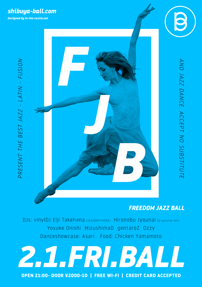 2.1.fri FJB -Freedom Jazz Ball- // DJs: vinylDJ Eiji Takehana (Jazzbrothers), Hironobu Jyounai (dj-jyounai.net), Yosuke Onishi, MizushimaD, gentaroZ, ozzy // Dance Showcase: Asari // Food: Chicken Yamamoto // Custom Stick Headphone: Sidecheck(stickheadphone.com) // OPEN 21:00- ¥2000-1D // shibuya-ball.com