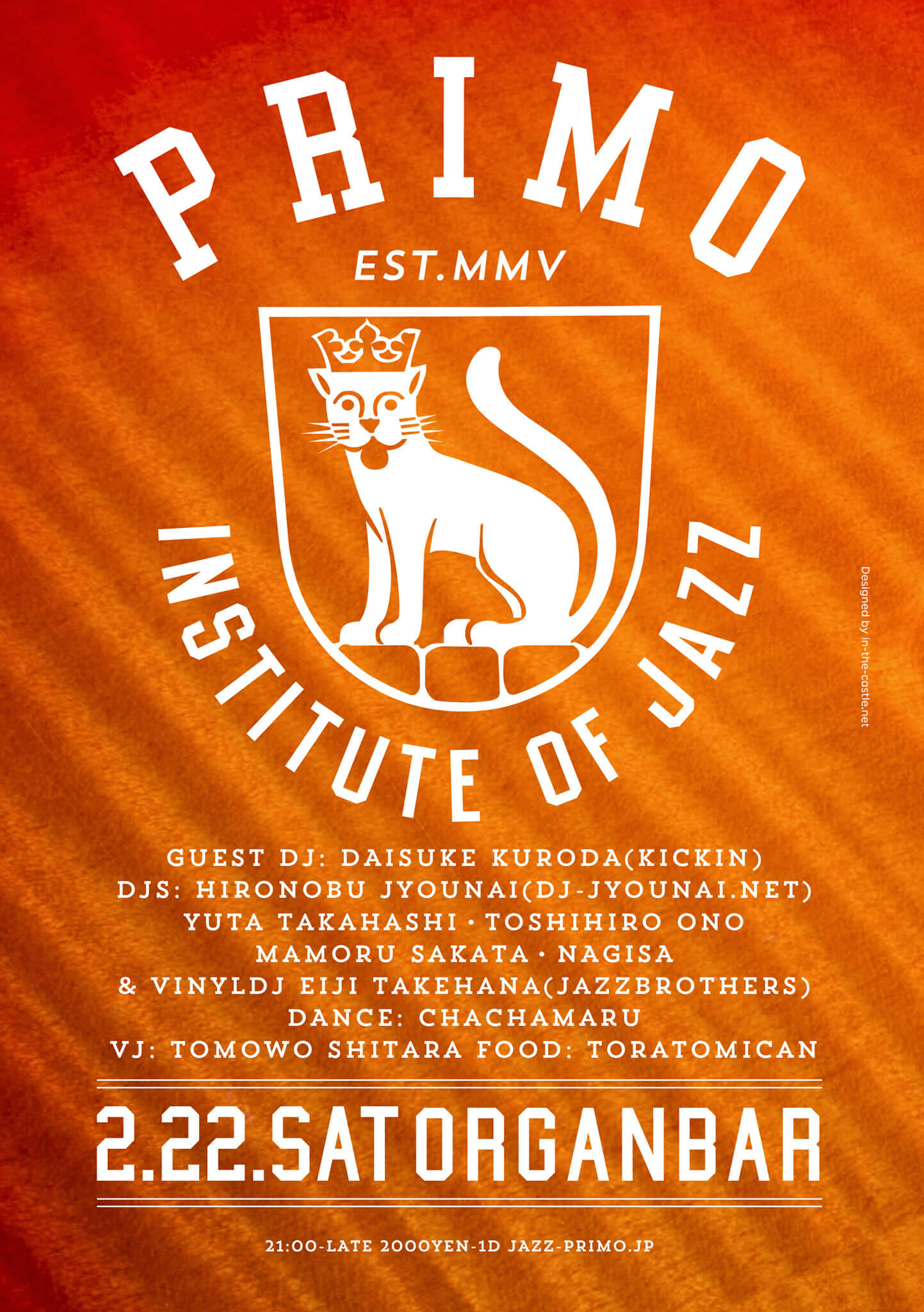 2.22.sat. PRIMO // Guest DJ: 黒田大介(kickin) // DJs: 城内宏信(dj-jyounai.net), 高橋雄太, 小野利大, 坂田守, Nagisa, & vinylDJ 竹花英二(Jazzbrothers) // DANCE : Chachamaru // VJ: 設楽トモヲ // Food: Tratomikan // OPEN 21:00 Charge ¥2000-1D+ミックステープ // To get there you should definitely go up the stairs with light steps! organ-b.net