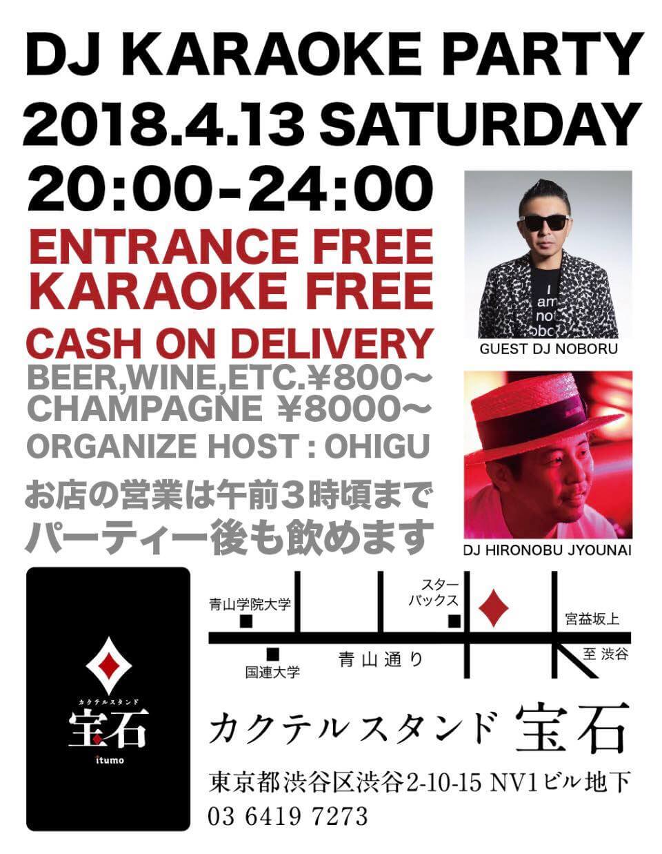 ヒグチさんオーガナイズによるDJ+カラオケイベント@青山カクテルスタンド宝石。先月好評により早くも2回目の開催です。普段は常設機材がないお店にDJセットを持ちこみながら常設カラオケシステムとDJをガチンコ勝負!させようという今までありそうでなかった企画。お店にとってはいろんなお客さんが足を運んでくれるきっかけになると同時に、DJにとっても普段とは異なる環境やお客さんの中で聞かせる曲の尺を工夫したり、至近距離でどう扇動したらよいかダイレクトに感じられて勉強になります。これはどんな曲にも置き換えられる感覚だと思うので前回開催の後に結構いい感じにDJできてるのもこのパーティーに誘っていただいたお陰だと思ってます。なにはともあれヒグチさんや世界的なヘアメイクアーティストでDJのNOBORUさん、お店の皆さんの人柄が感じられる楽しい社交場ですので金曜日のお仕事帰りに皆さんで遊びにいらしてください。宮益坂上の歩道橋を渡り青山通りを青学方面へ。スターバックスの手前にあるアイスクリームバーの地下、黒赤白の看板「宝石◆」が目印です。
