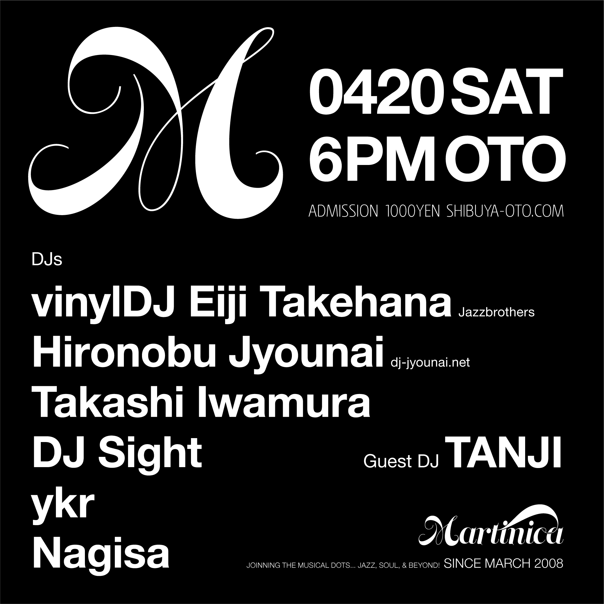 4.20.sat Martinica // Guest: TANJI // DJs: vinylDJ Eiji Takehana(Jazzbrothers), Hironobu Jyounai(dj-jyounai.net), Takashi Iwamura, DJ Sight, ykr, Nagisa // OPEN 18:00-23:00 ¥1000-NoD // shibuya-oto.com