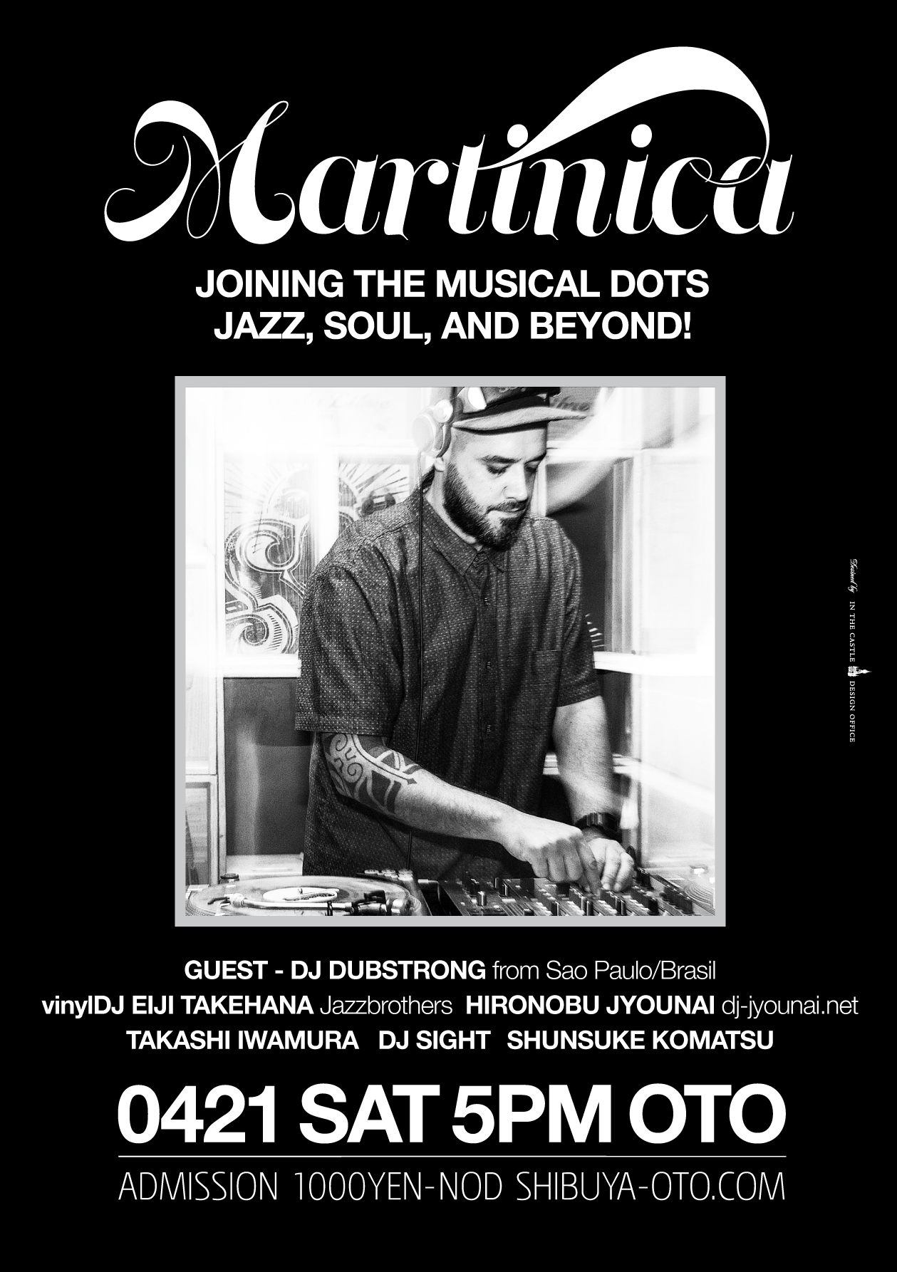 4.21.sat. Martinica // GuestDJ:DJ Dubstrong // DJs: vinylDJ Eiji Takehana(Jazzbrothers), Hironobu Jyounai(dj-jyounai.net), Takashi Iwamura, DJ Sight, Shunsuke Komatsu // Snokey Record will give s sales exivision // OPEN 17:00-23:00 ¥1000-NoD // http://www.shibuya-oto.com