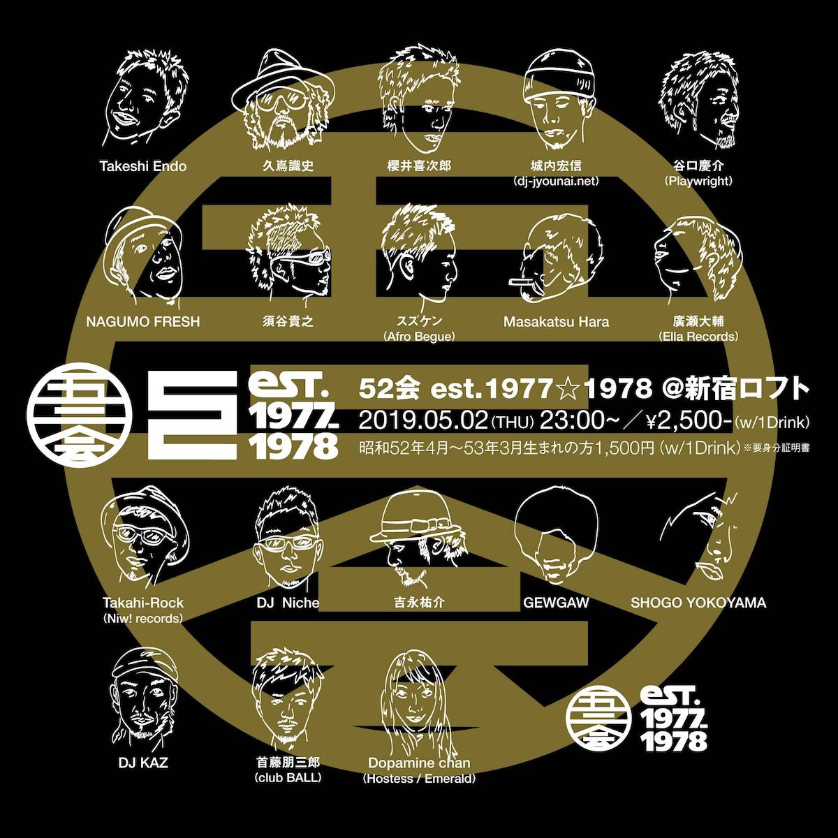 OPEN 23:30 / START 23:30 当日のみ¥2500(DRINK代別¥600) 昭和52年4月~53年3月生まれの方、1,500円(1drink付き) ※要身分証明書