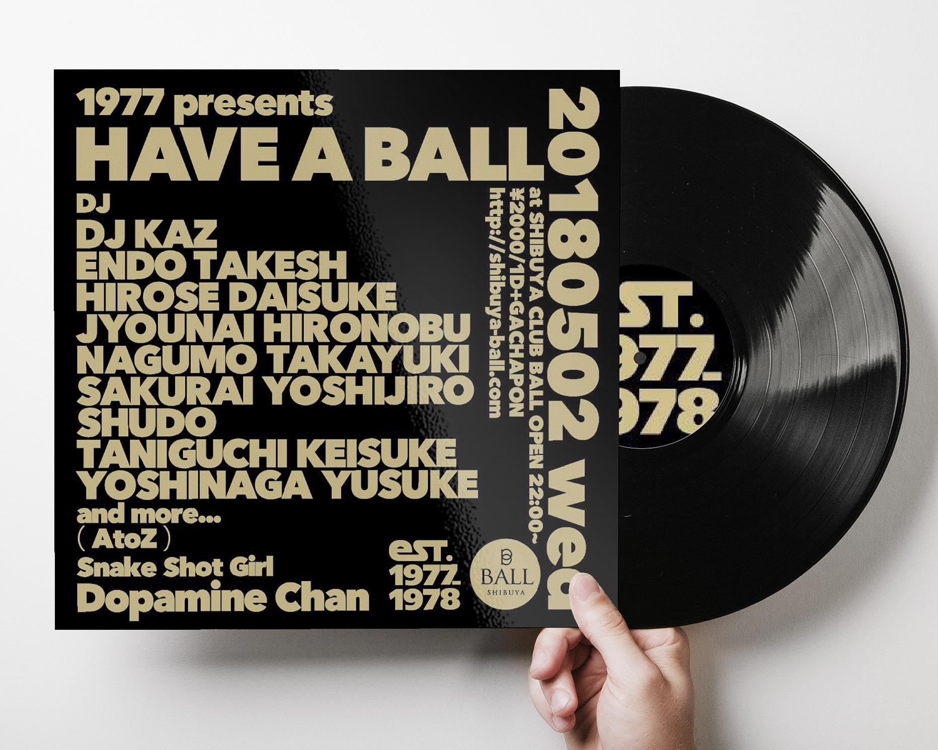 5.2.wed 1977 presents HAVE A BALL // DJs: DJ KAZ, Endo Takesh, Hirose Daisuke, Jyounai Hironobu, Nagumo Takayuki, Sakurai Yoshijiro, SHUDO, Taniguchi Keisuke , Yoshinaga Yusuke // Snake Shot Girl: Dopamine Chan // OPEN 22:00 ¥2000/1D+capsule toy // shibya-ball.com