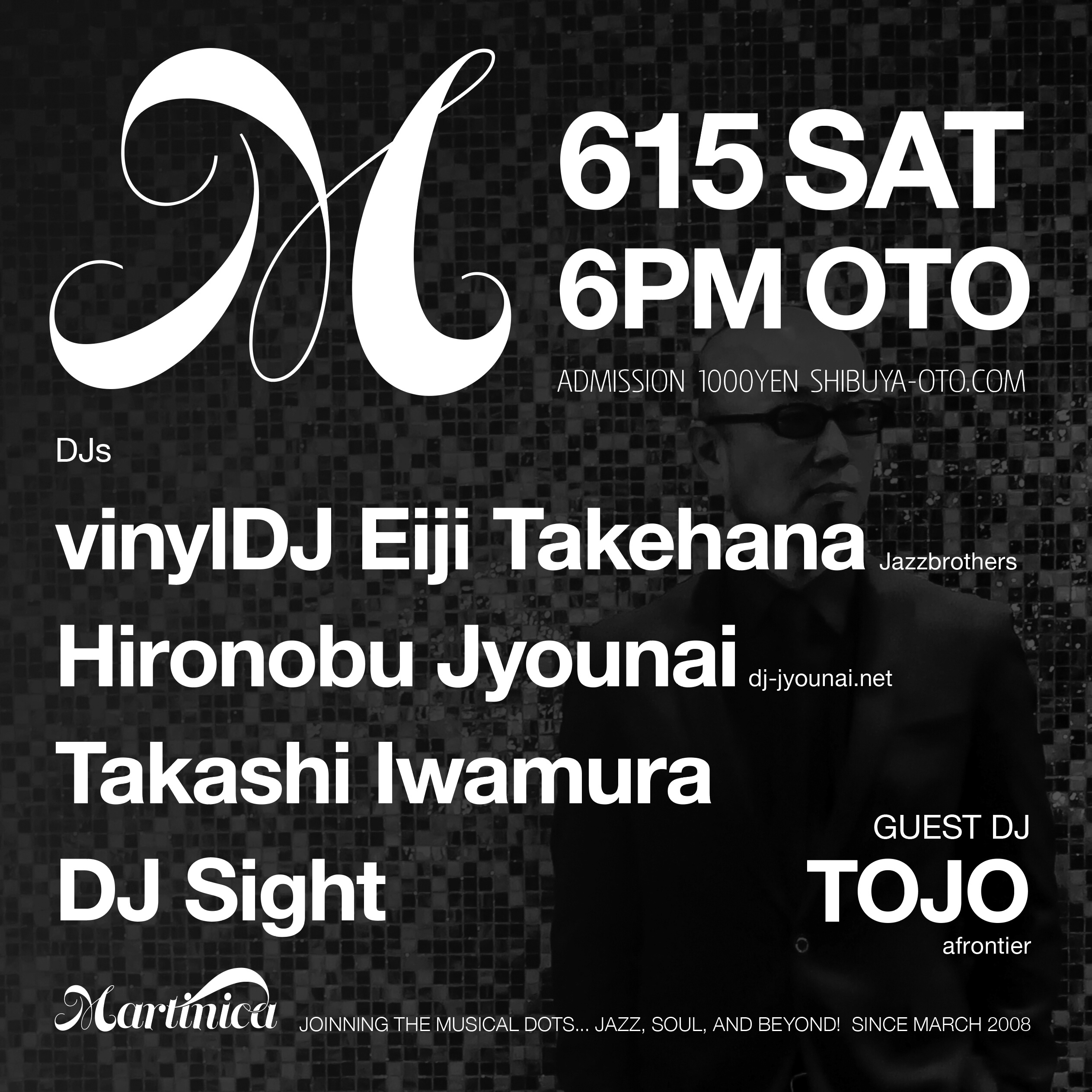 6.15.sat Martinica // Guest DJ: TOJO(Afrontier) // DJs: vinylDJ Eiji Takehana(Jazzbrothers), Hironobu Jyounai(dj-jyounai.net), Takashi Iwamura , DJ Sight // OPEN 18:00-23:00 ¥1000-NoD // shibuya-oto.com