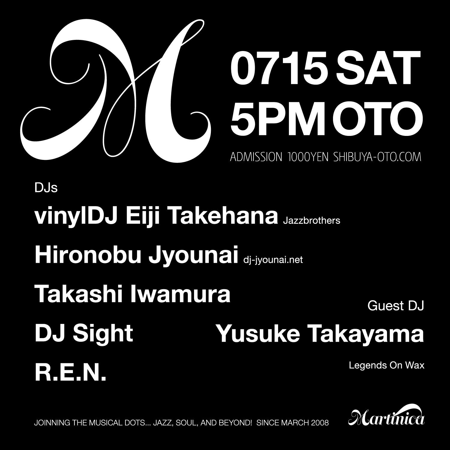7.15.sat. Martinica // Guest: Yusuke Takayama(LEGENDS ON WAX) // DJs: vinylDJ Eiji Takehana(Jazzbrothers), Hironobu Jyounai(dj-jyounai.net), Takashi Iwamura, DJ Sight, R.E.N. // OPEN 17:00 ¥1000 No-D