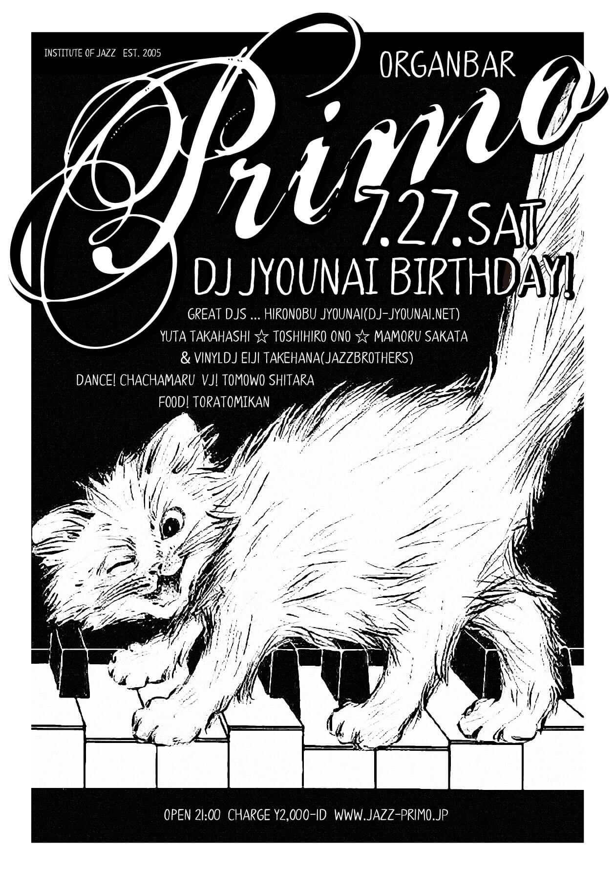 7.27.sat. PRIMO -DJ JYOUNAI BIRTHDAY- // DJs: Hironobu Jyounai(dj-jyounai.net), Yuta Takahashi, Toshihiro Ono, Mamoru Sakata, & vinylDJ Eiji Takehana(Jazzbrothers) // DANCE : Chachamaru // VJ: Tomowo Shitara // Food: toratomikan // OPEN 21:00 Charge ¥2000-1D // To get there you should definitely go up the stairs with light steps! organ-b.net