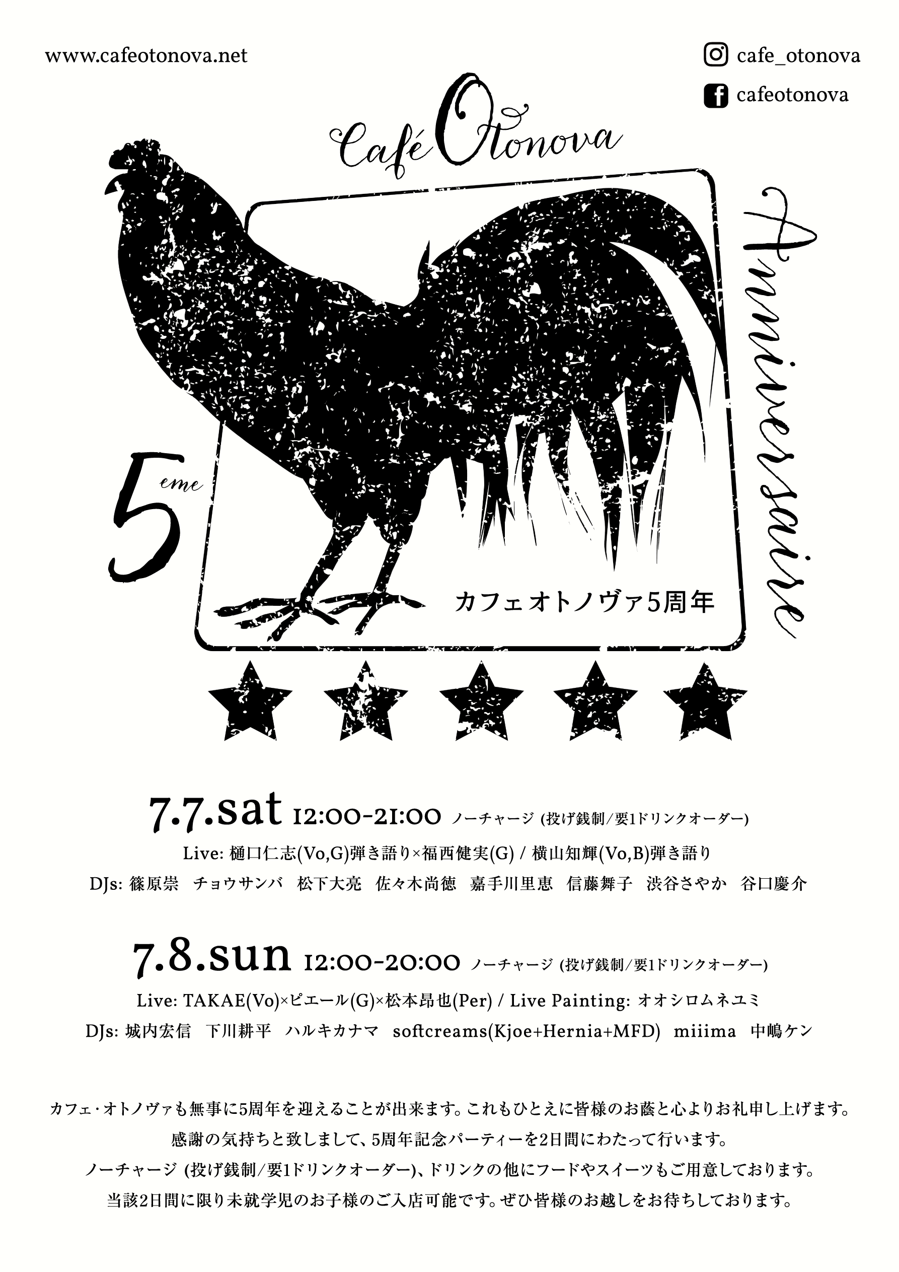 渋谷君が2013年に浅草にオープンさせたお店「Cafe Otonova(カフェオトノヴァ)」も5周年。渋谷君 : 「真ん中の星いらなくね?」城内 : 「ノヴァだから入れといた方が絶対良いから」渋谷君 : 「じゃ入れとく」って感じにロゴをデザインした際のやりとりも懐かしく感じます。ノーチャージ(投げ銭制/要1ドリンクオーダー) 当該2日間に限り未就学児のお子様のご入店可能です。cafeotonova.net