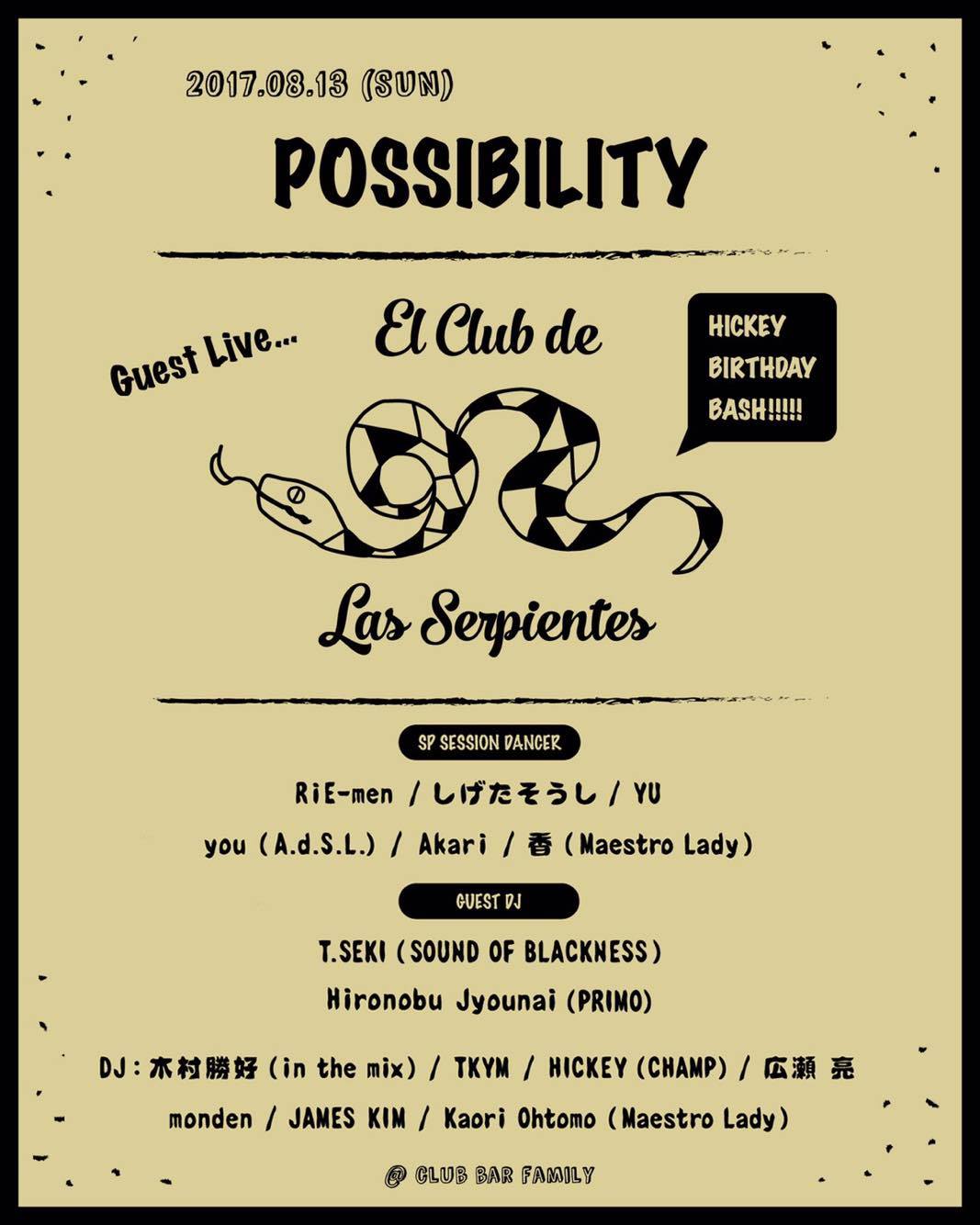 8.13.Sun. Possibility // Guest Live: El Club de Las Serpientes – Takashi Nakazato(per),Tetta(g), Ryozo(b) ,Temjin(tp), Yu Hagiwara(sax) // SP Session Dancer: RiE-men, shigetasoushi, YU, you(A.d.S.L),Akari(Maestro Lady), Kaori(Maestro Lady) // Guest DJ : T.Seki(Sounds Of Blackness), Hironobu Jyounai(dj-jyounai.net), Da Stimpy // DJs : Masayoshi Kimura(in the mix), Tkym, Hickey(Champ), James Kim // OPEN 17:00-23:00 // ¥2000-1D *Bring this flyer pics for special discount(¥1000-NoD) // club-bar-family.com