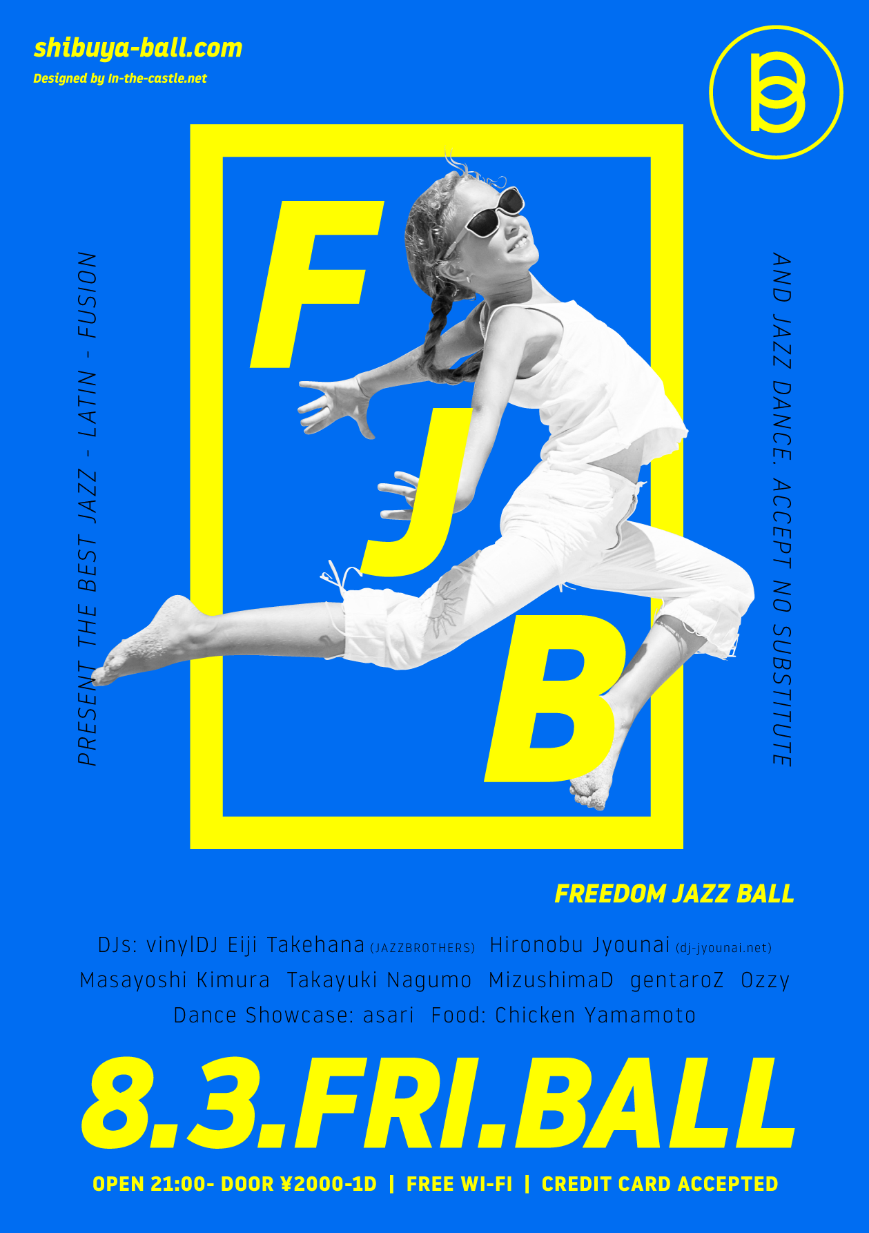 8.3.fri FJB -Freedom Jazz Ball- // DJs: vinyl DJ Eiji Takehana (Jazzbrothers), Hironobu Jyounai (dj-jyounai.net), Masayoshi Kimura, Takayuki Nagumo, MizushimaD, gentaroZ, Ozzy // Dance Showcase: Asari // Food: Chicken Yamamoto // OPEN 21:00- ¥2000-1D // Free Wi-Fi. Credit Card Accepted. // shibuya-ball.com
