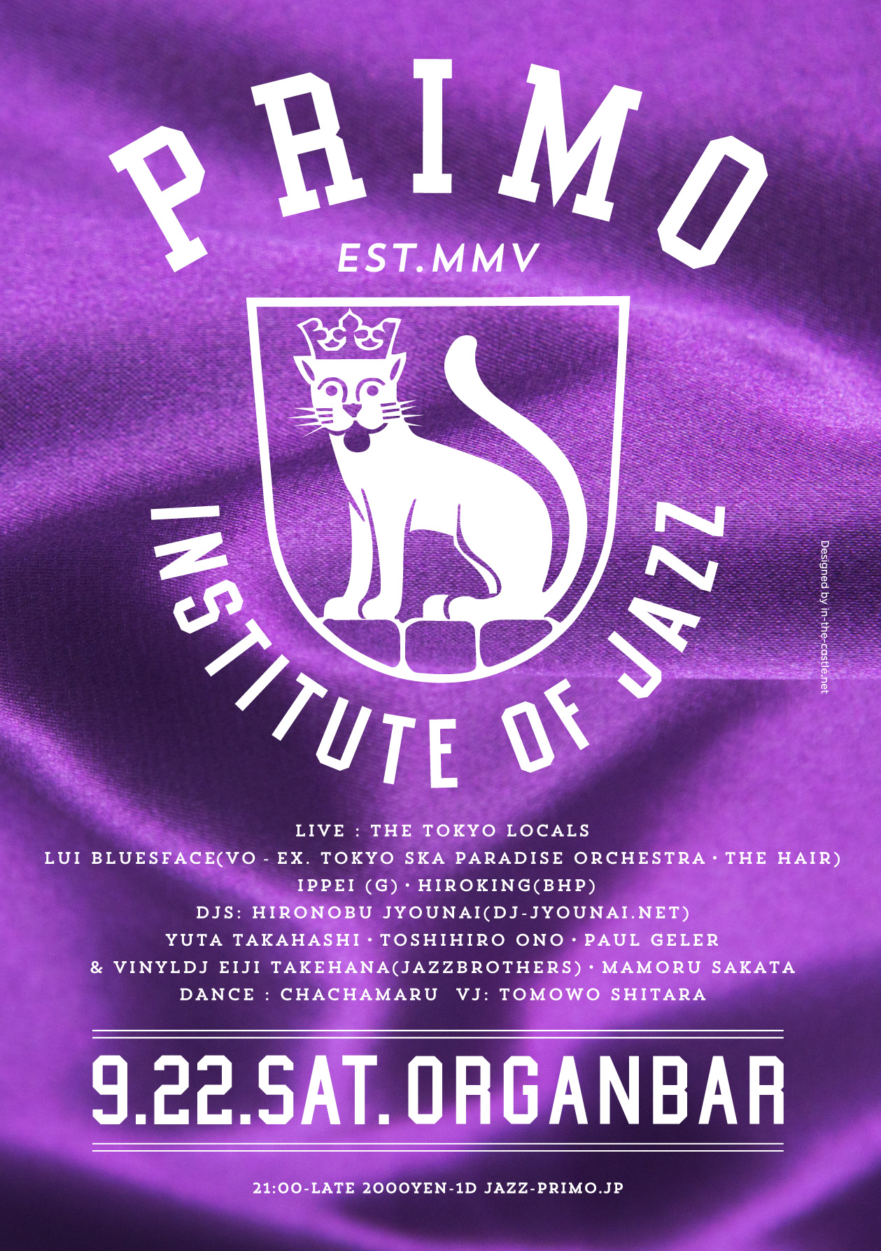 9.22.sat PRIMO // Live : The Tokyo Locals – Lui Bluesface (vo : ex.東京スカパラダイスオーケストラ,THE HaiR), Ippei (g), Hiroking(bhp) // DJs: Hironobu Jyounai(dj-jyounai.net), Yuta Takahashi, Toshihiro Ono, Paul Geler & vinylDJ Eiji Takehana(Jazzbrothers), Mamoru Sakata // DANCE : Chachamaru // VJ: Tomowo Shitara // OPEN 21:00 ¥2000-1D // To get there you should definitely go up the stairs with light steps!