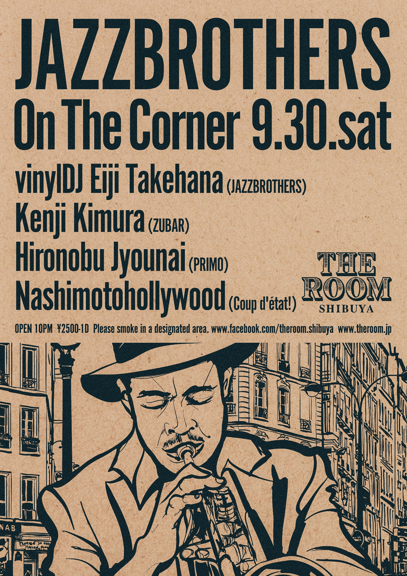 9.30.sat.JAZZBROTHERS ON THE CORNER // DJs: vinylDJ 竹花 英二(JAZZBROTHERS), 木村 健二(頭BAR), 城内 宏信(dj-jyounai.net), Nashimotohollywood(Coup d’état!) // OPEN 22:00 ¥2500-1D // Please smoke in a designated area.