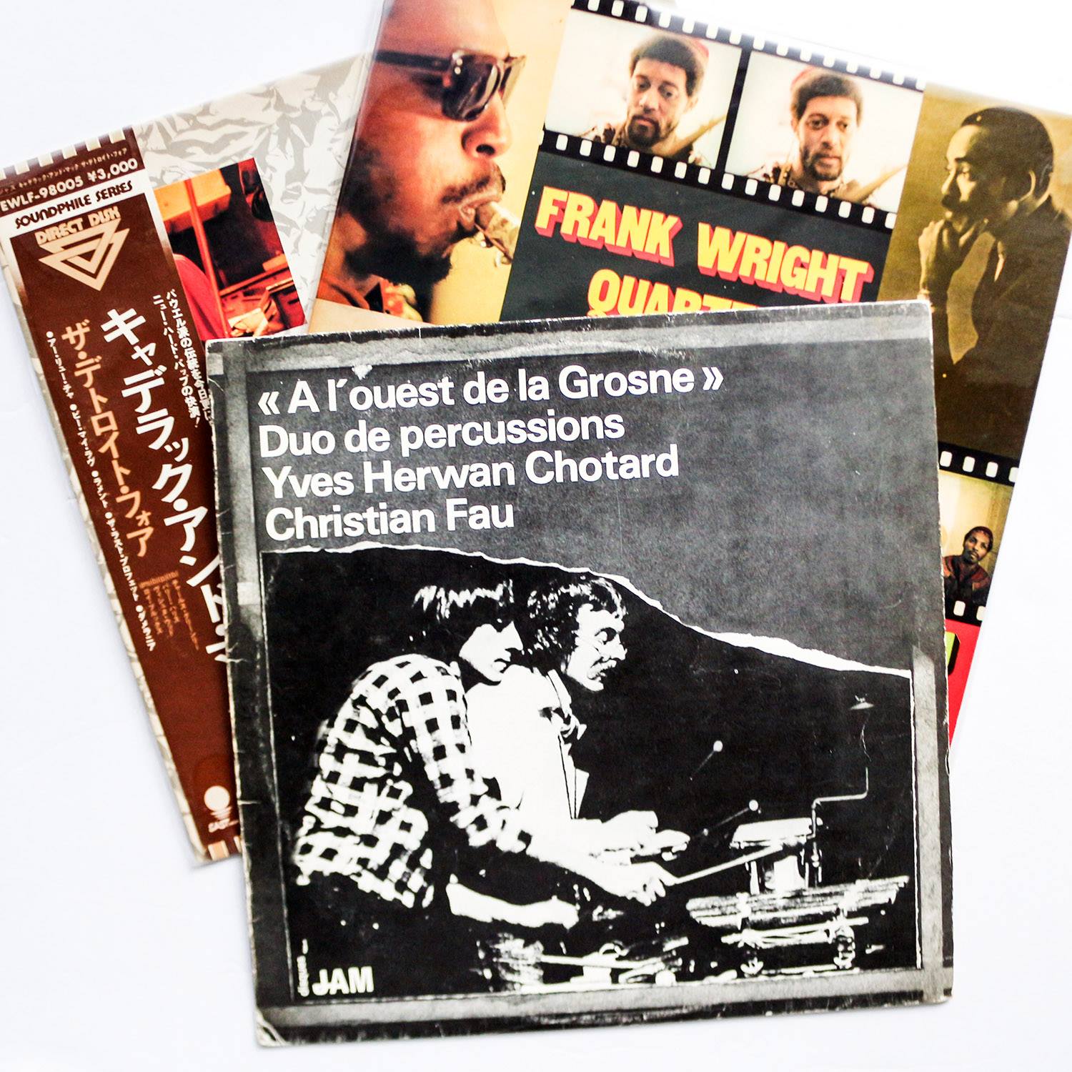 中央 : 「Yves Herwan-Chotard, Christian Fau – A L’Ouest De La Grosne」 リヨンのちょい上の街で録音されたフリージャズ〜移民系民族音楽まで幅広くこなす打楽器奏者二人によるライブ盤。アーチー・シェップのガリアーノネタになっている盤にカリビアンテイストをプラスした感じでかなりかっこいい。右上 : 「Frank Wright Quartet – Uhuru Na Umoja」見つけたらとりあえず買っておくフランク・ライト。フランスに移住した翌年にノア・ハワードと一緒にやっている盤。強烈なビートにやりすぎ感ありすぎな掛け合いでお腹いっぱいですが熱量ハンパない。タイトルはスワヒリ語で「自由とユニティ」との事。左上 : 「The Detroit Four – Cadillac And Mack」東芝EMI企画の日本盤。想像と違い地味すぎてスルー…かと思いましたが、B2のロイ・ブルックス作のいぶし銀ラテンジャズが★でした。